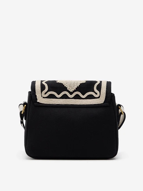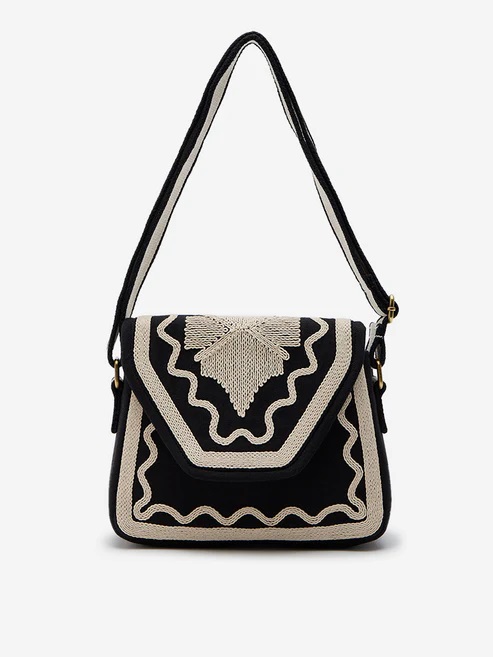 Where heritage craftsmanship meets everyday elegance — the Kiran Shoulder Bag is a beautifully structured accessory designed to stand out. Crafted in a striking black and cream palette, it features bold, contrast embroidery with a central leaf-inspired motif and intricate wave detailing that adds artistic texture and depth.