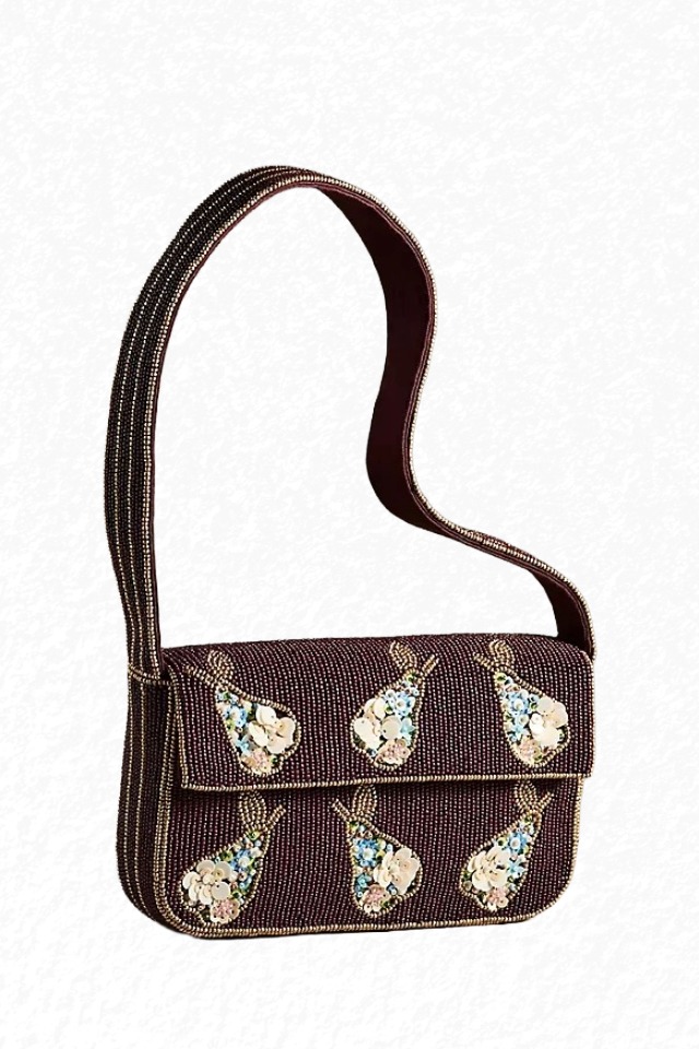 Set against a rich fabric base, the beadwork showcases a mix of shimmering glass beads and sequins that catch the light with every movement. The carefully embroidered pears offer a whimsical nod to nature’s sweetness, while the detailed floral elements add a touch of romantic flair.