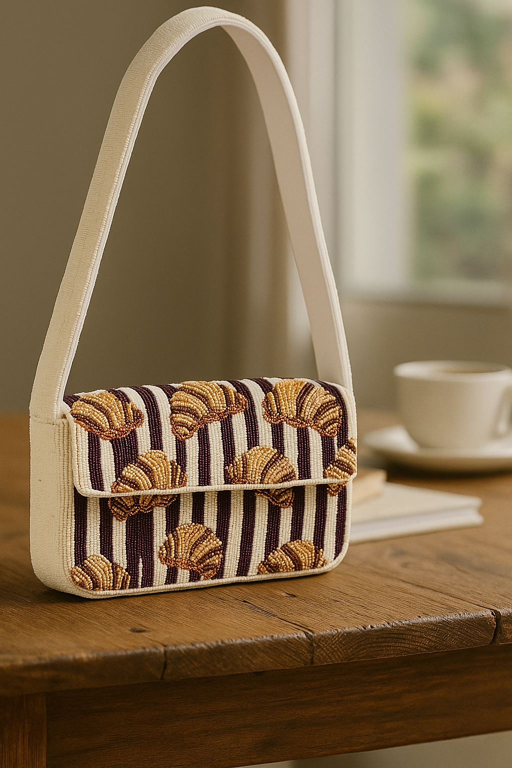 Bring a touch of Parisian charm to your style with the Parisian Croissant Beaded Bag—a delightful fusion of playful artistry and timeless elegance. Hand-beaded with meticulous detail, this bag features whimsical croissant motifs against chic vertical stripes, evoking the cozy mornings of a French café.