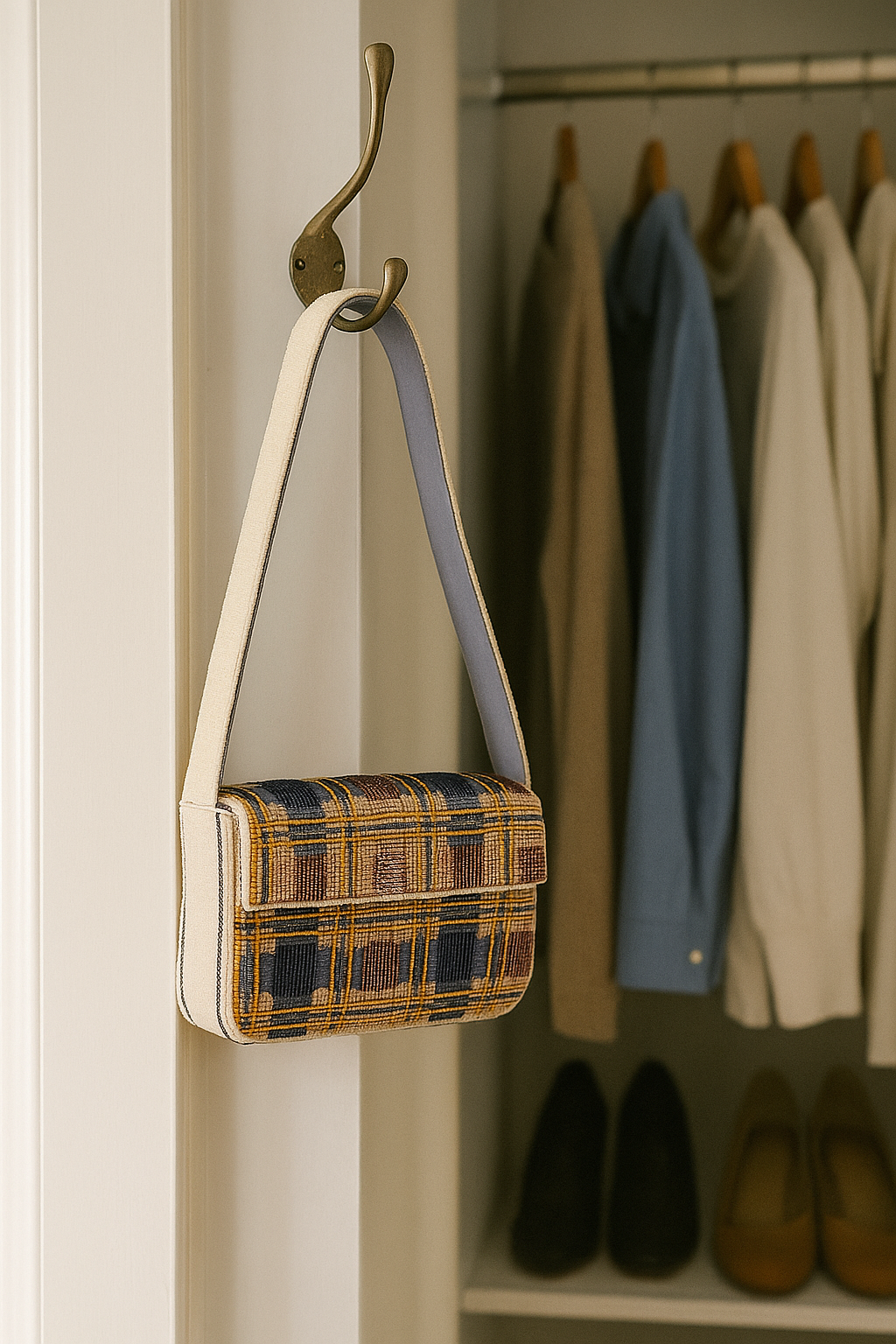 Classic plaid meets hand-beaded artistry in the Zayana Beaded Bag – Sunset Plaid Edition. Designed for those who love timeless patterns with a contemporary twist, this bag features a beautifully intricate plaid design in warm sunset hues of gold, blush, navy, and soft peach. Each bead is hand-sewn with precision, giving the bag a refined yet artisanal character.